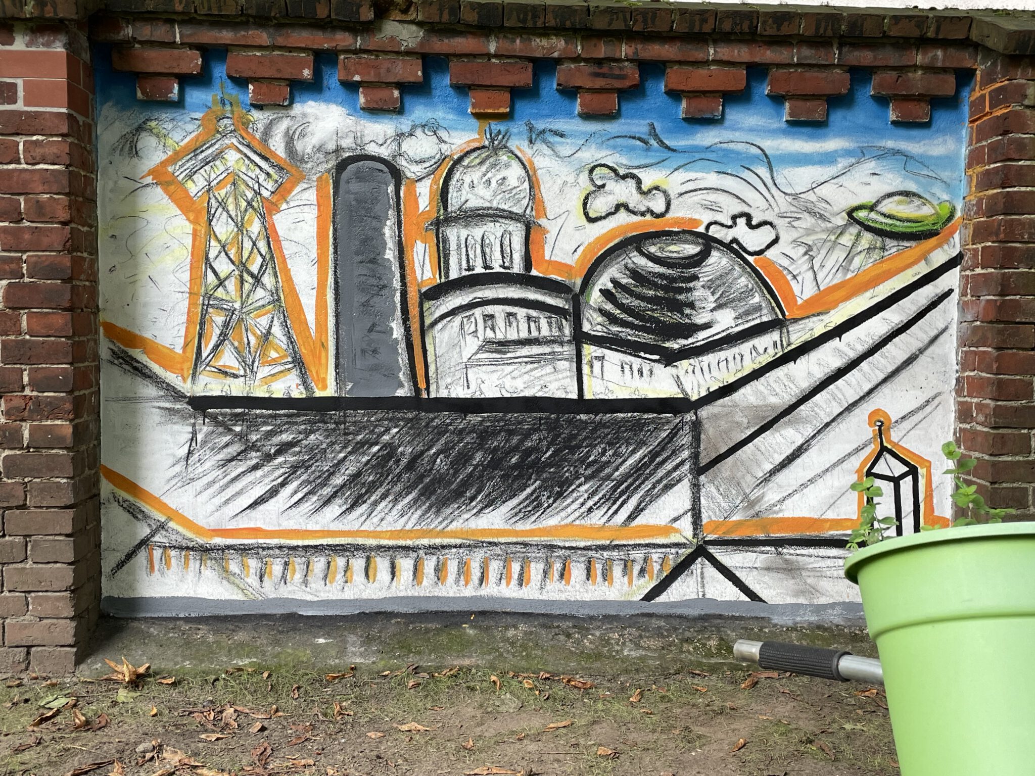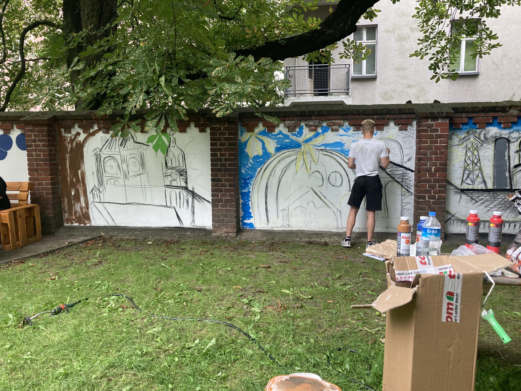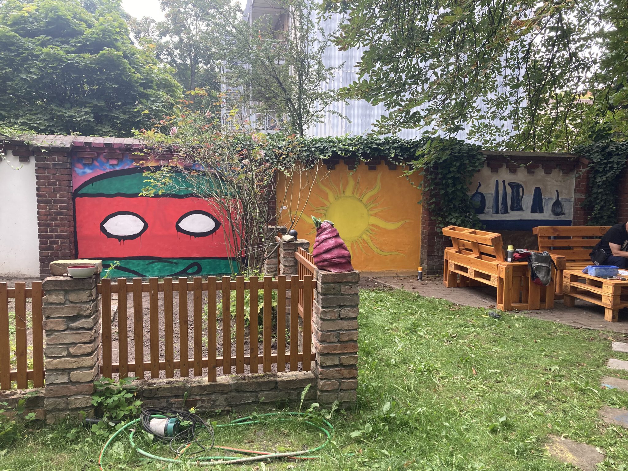 Im Rahmen eines Gruppenangebots haben Klient*innen der Ambulanten Wohnhilfe die Mauern im Garten der Regionalstelle Lückstraße künstlerisch gestaltet. Diese kreative Aktion ermöglichte es den Teilnehmenden, ihre eigenen Ideen und Gefühle auszudrücken und ihre Umgebung aktiv mitzugestalten. Dabei sind viele unterschiedliche Kunstwerke entstanden, die in ihrer Vielfalt die individuellen Perspektiven der Teilnehmenden vor allem auf die Stadt Berlin widerspiegeln. Dieses Projekt förderte das kreative Potenzial der Beteiligten und trug zu einem positiven, inspirierenden Umfeld bei.